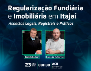 Evento especial voltado aos profissionais e interessados. O encontro abordará os desafios e soluções práticas da regularização fundiária e imobiliária no município de Itajaí, com foco nos aspectos legais, registrais e administrativos. Duas palestras compõem a programação: